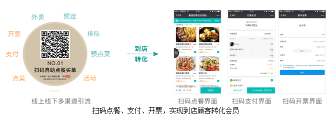 借助会员平台,系统介入点餐、支付收银、开票、排队、预订、外卖等消费者就餐流程的每一个环节,通过自然而然的方式就将到店顾客转化为商家会员。这种融入到消费者就餐流程中的会员转化方式,在满足消费者就餐便捷性需求的同时,也弱化了消费者的心理抵触,让到店会员转化更简单更高效。