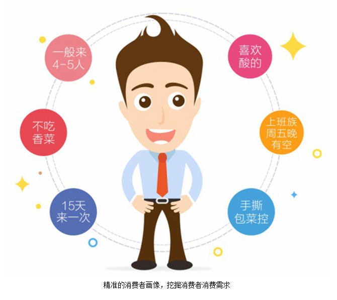 当然,消费者画像也是不必不可少的,通过分析会员消费数据,掌握消费者的消费水平、动机、频次、习惯、偏好、口味等数据,系统就可以匹配商家需求和会员需求,在最合适的时间(推送触发时机),以最酷的呈现方式(推荐力度/使用条件/前端界面/推荐理由),给消费者送上最爱的美食优惠(美食消费偏好)。